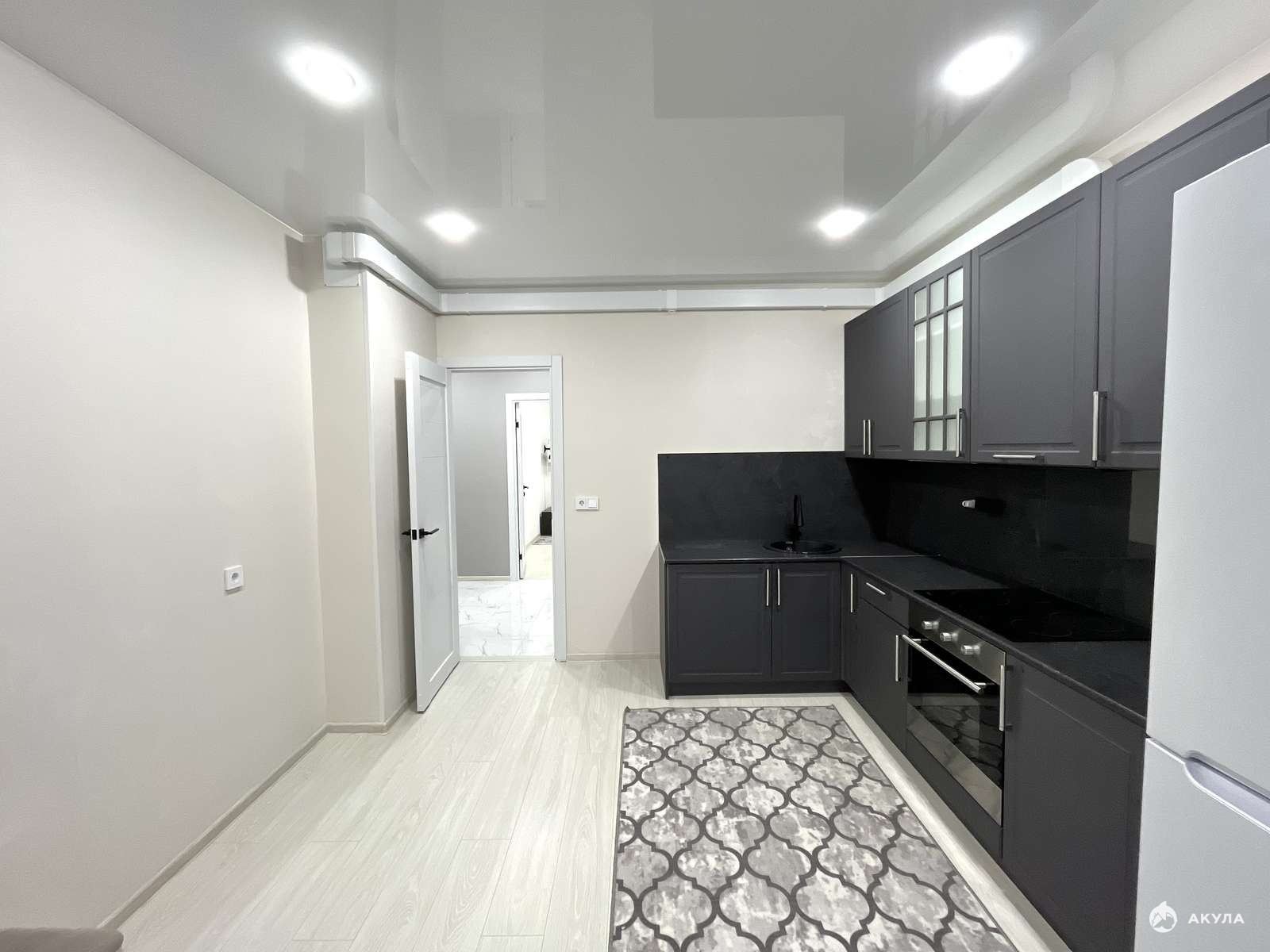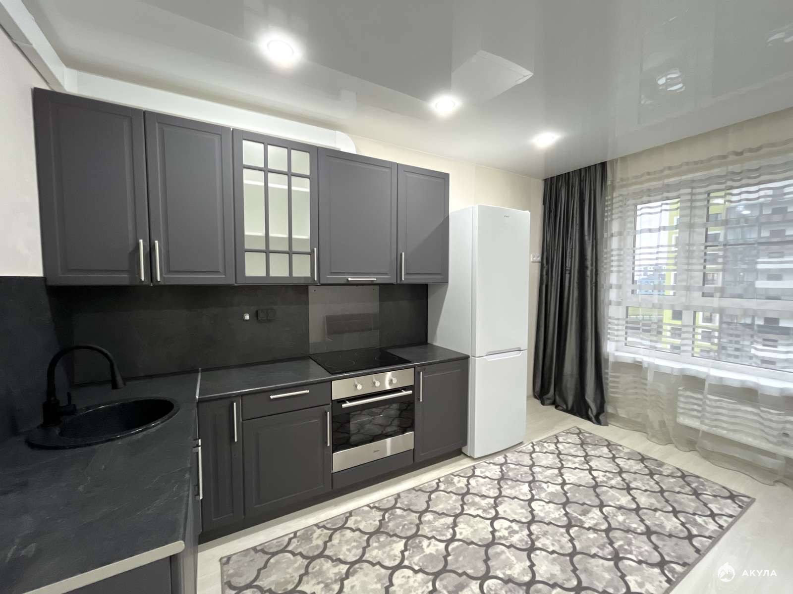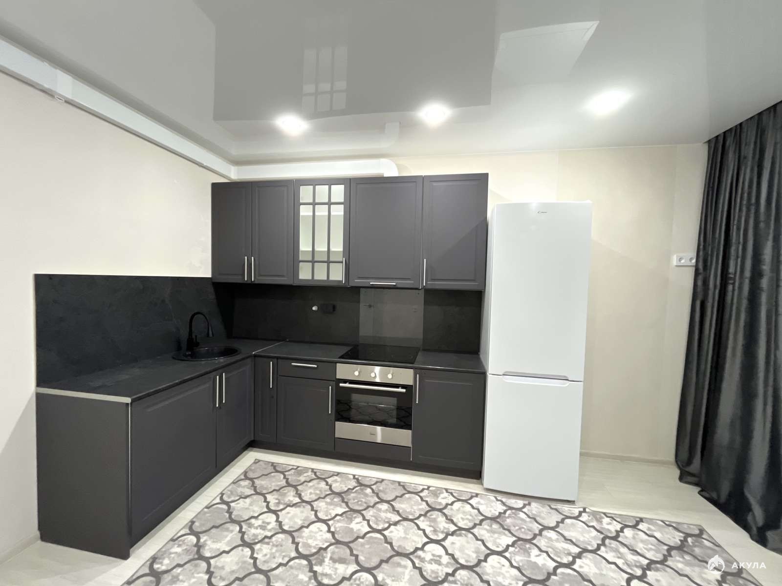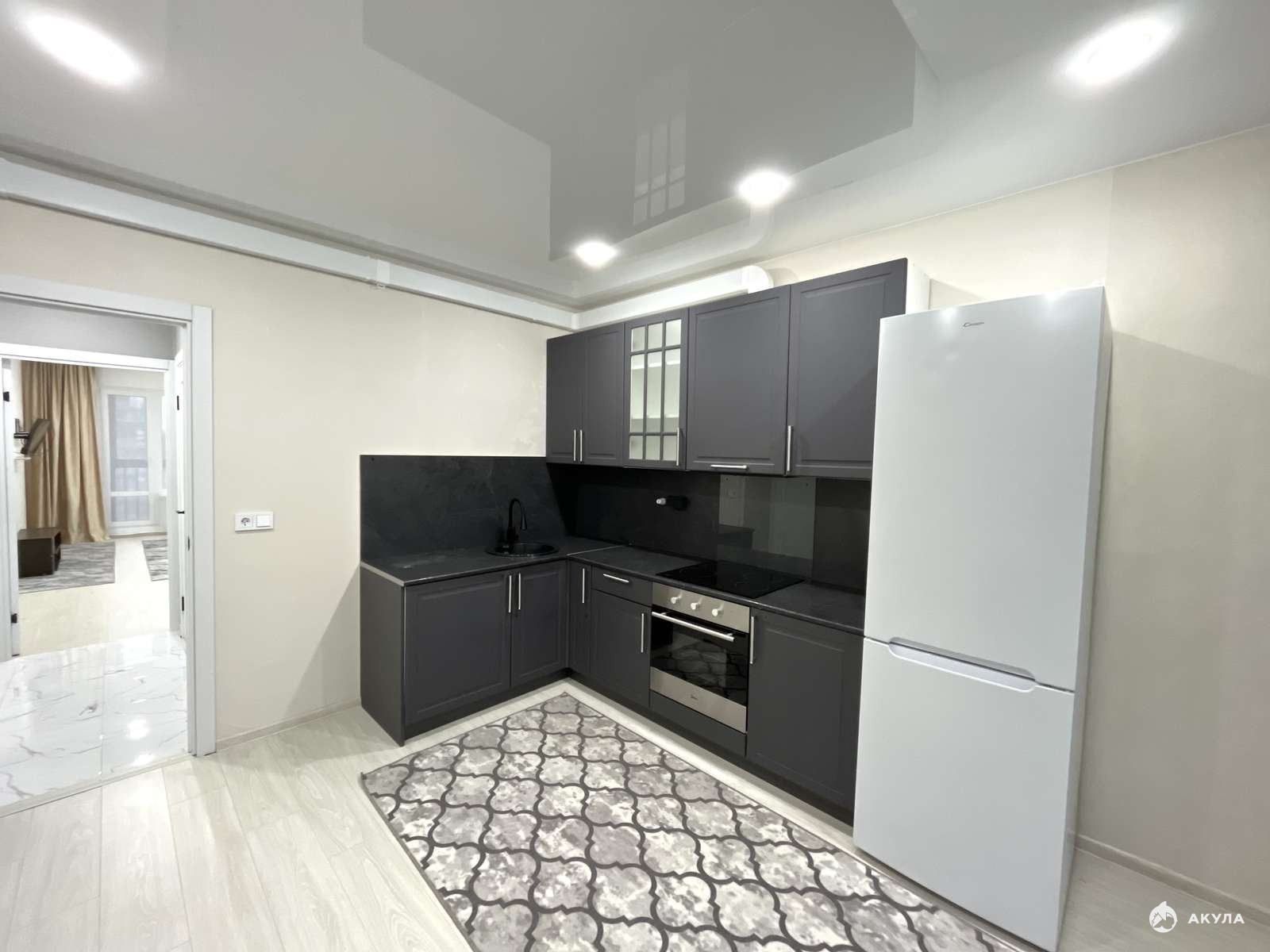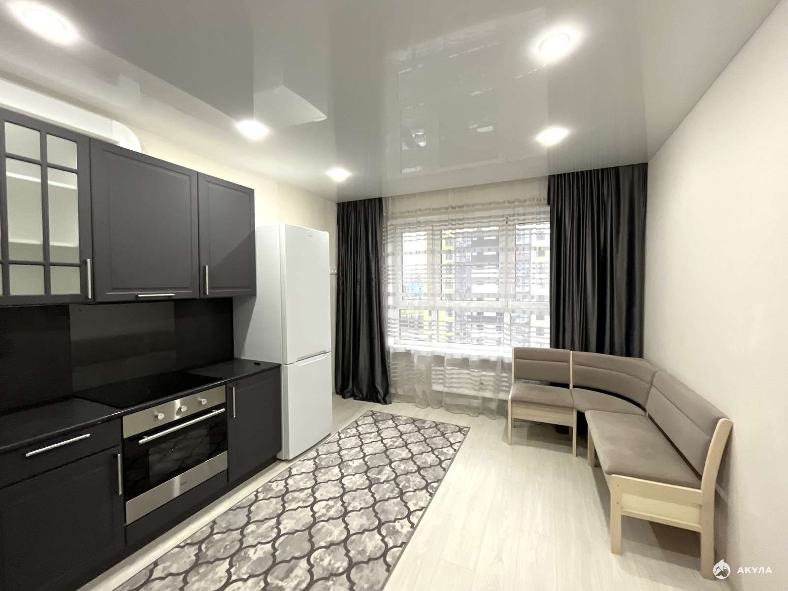 - Встроенная кухня с техникой: электрическая варочный панель, духовой шкаф, вытяжка, холодильник, микроволновая печь