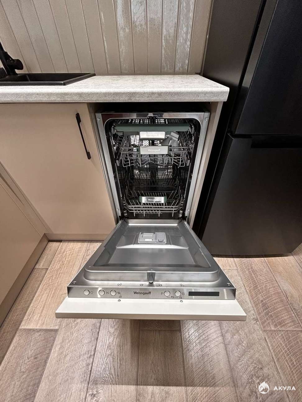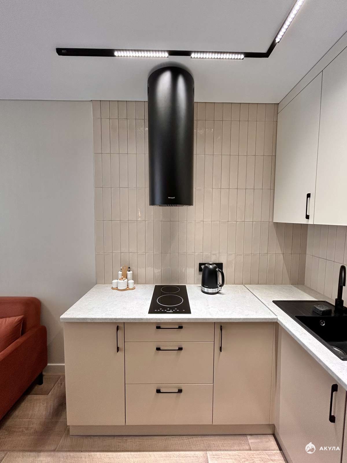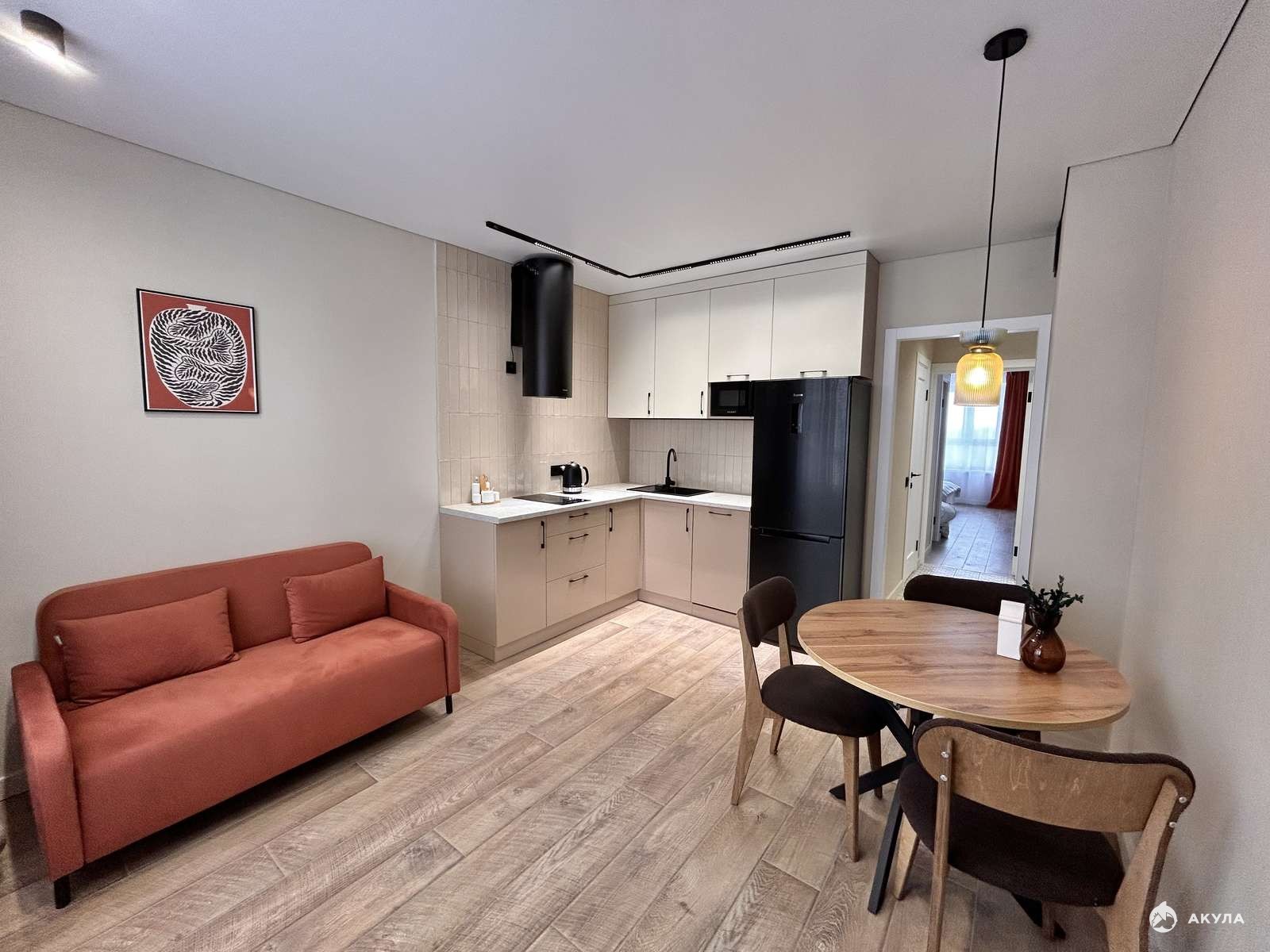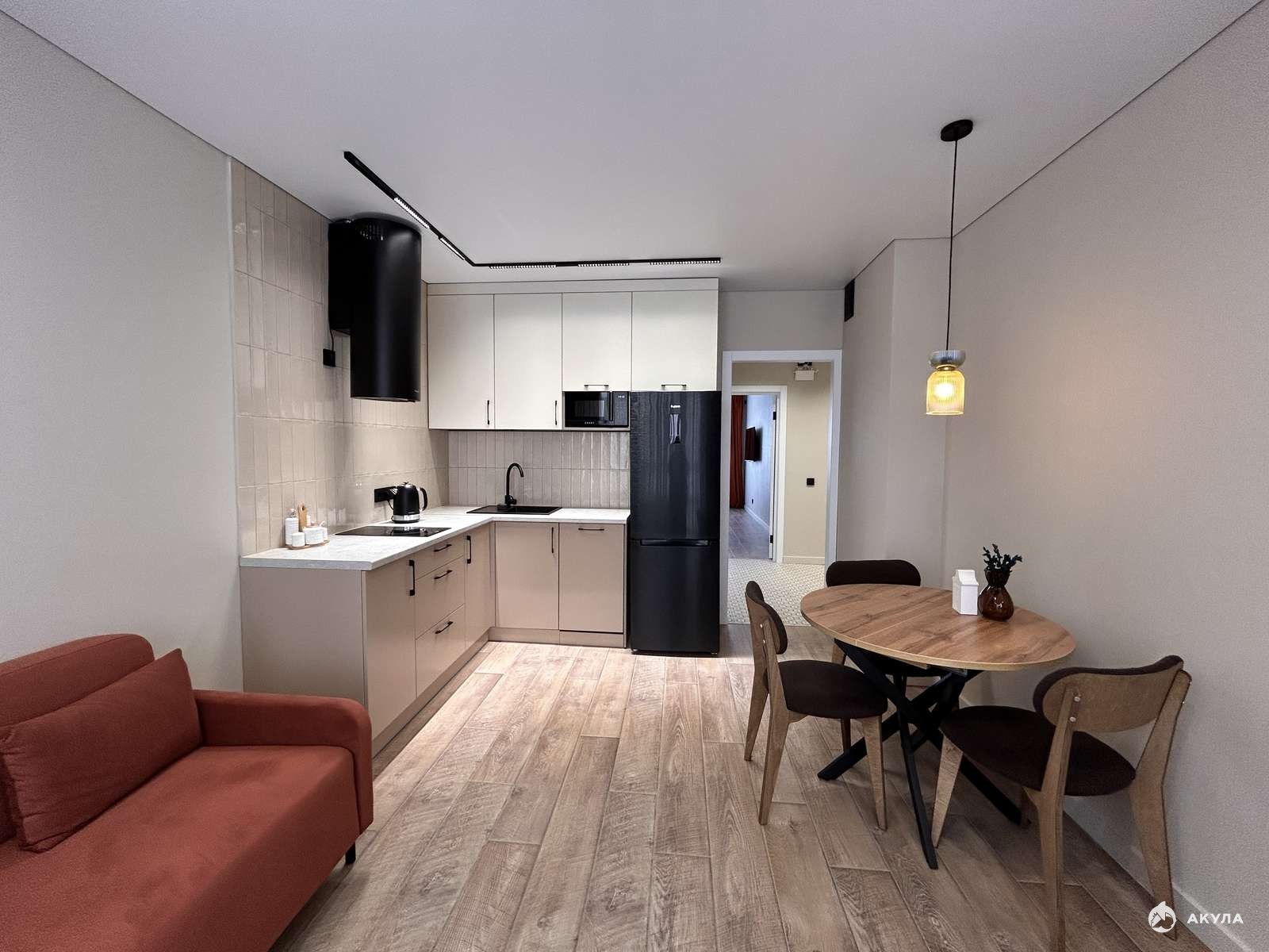 ✅ Кухонный гарнитур со встроенной бытовой техникой (холодильник, электроплита, вытяжка, посудомоечная машина, микроволновая печь), диван на кухне, кухонный стол и стулья.