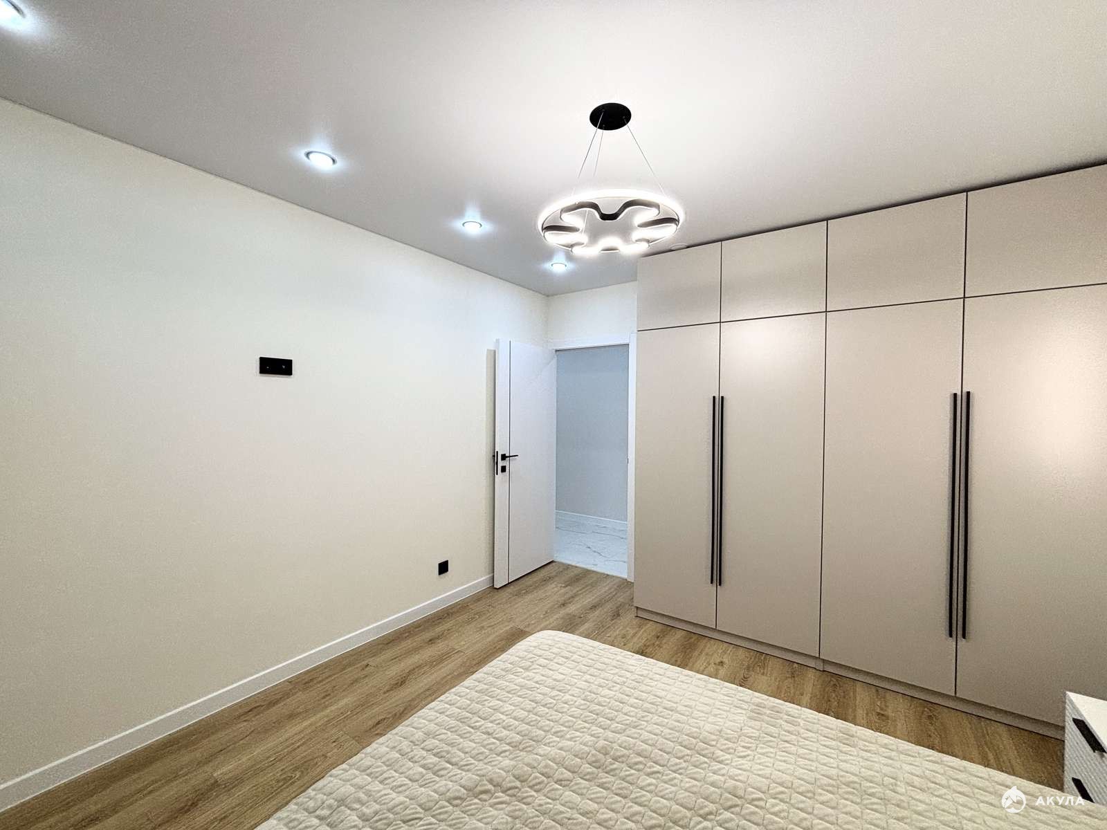 В спальне просторная двуспальная кровать и большой шкаф с множеством места для хранения.