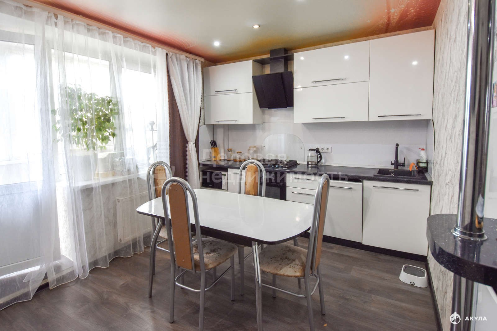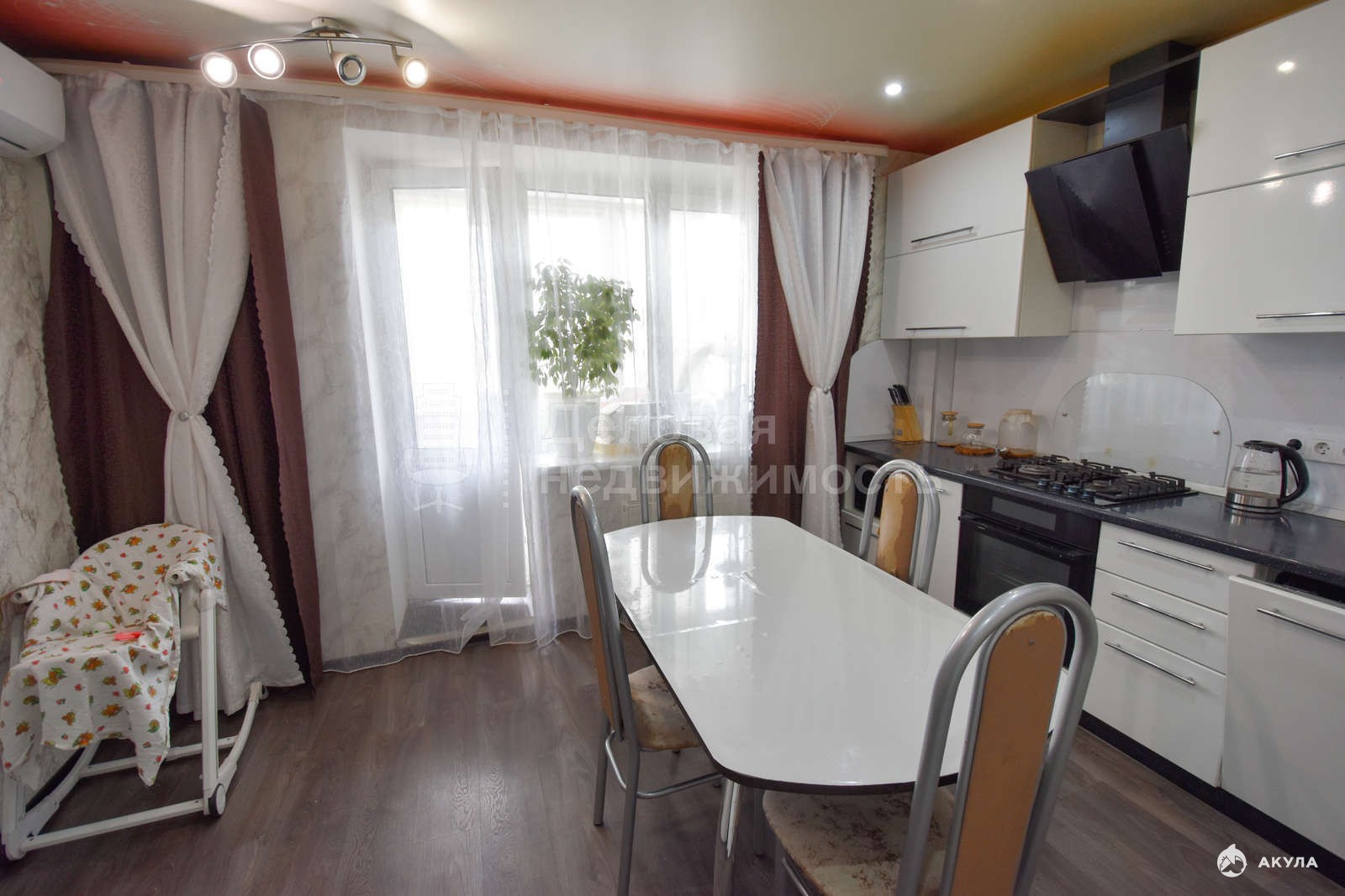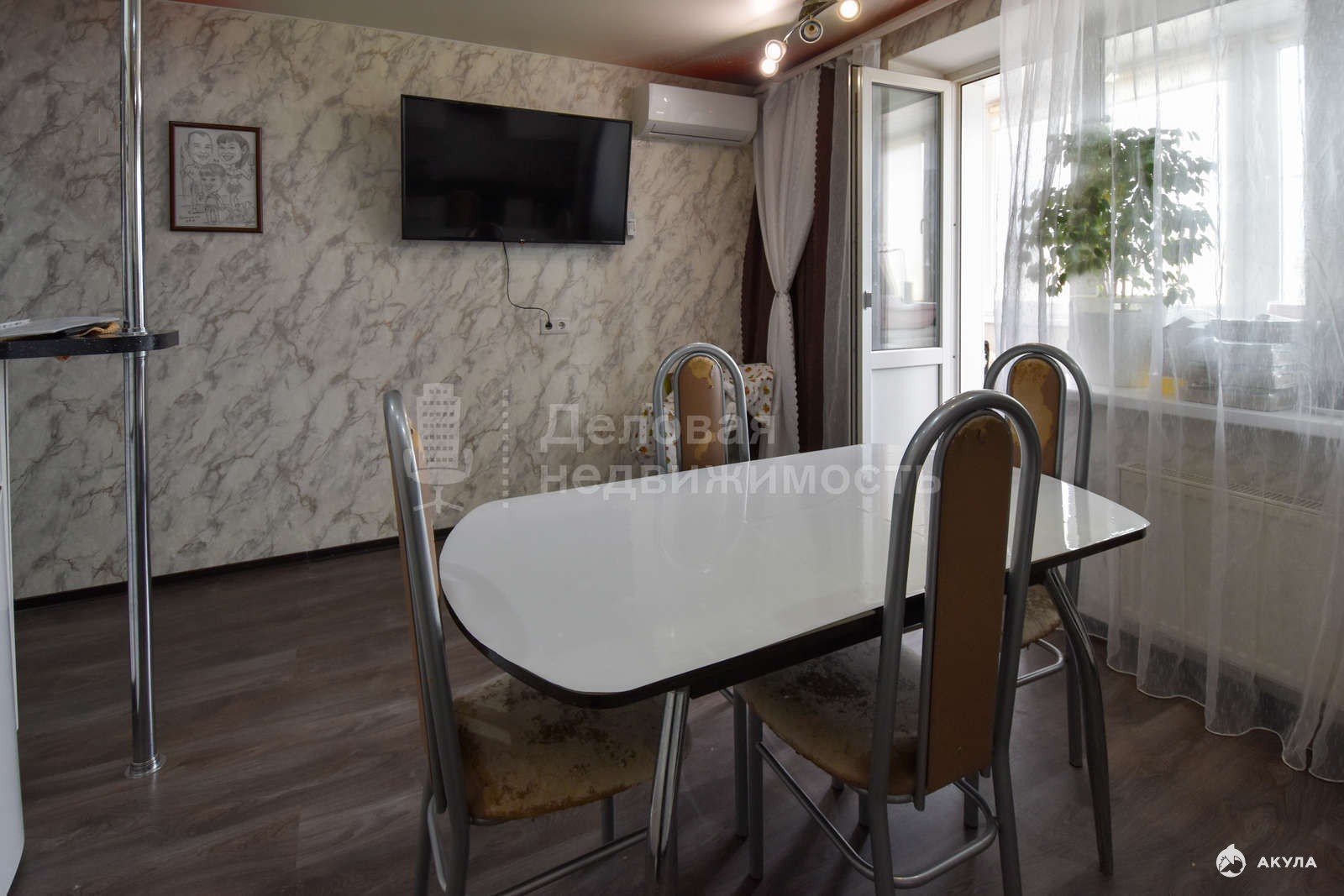 В квартире выполнен хороший ремонт: полы ламинат, натяжные потолки, стены выровнены, новые двери, с/у кафель. Квартира очень теплая и светлая. Остается встроенная корпусная мебель с техникой в кухне, корпусная мебель в прихожей, кондиционер.